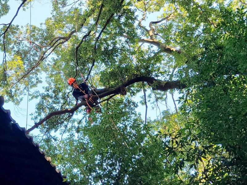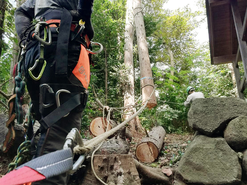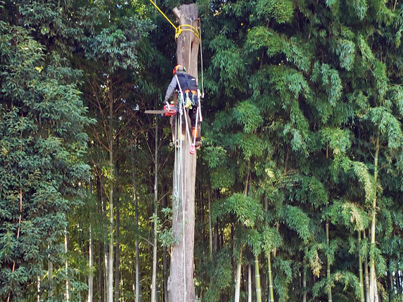 重機が使用できない現場におけるロープワークを使った高木特殊伐採・剪定もお任せください。また、大切な植物を大径木に至るまで丁寧に移植し根付かせてきた豊富な経験と実績があります。難しい現場でもまずはご相談ください。
